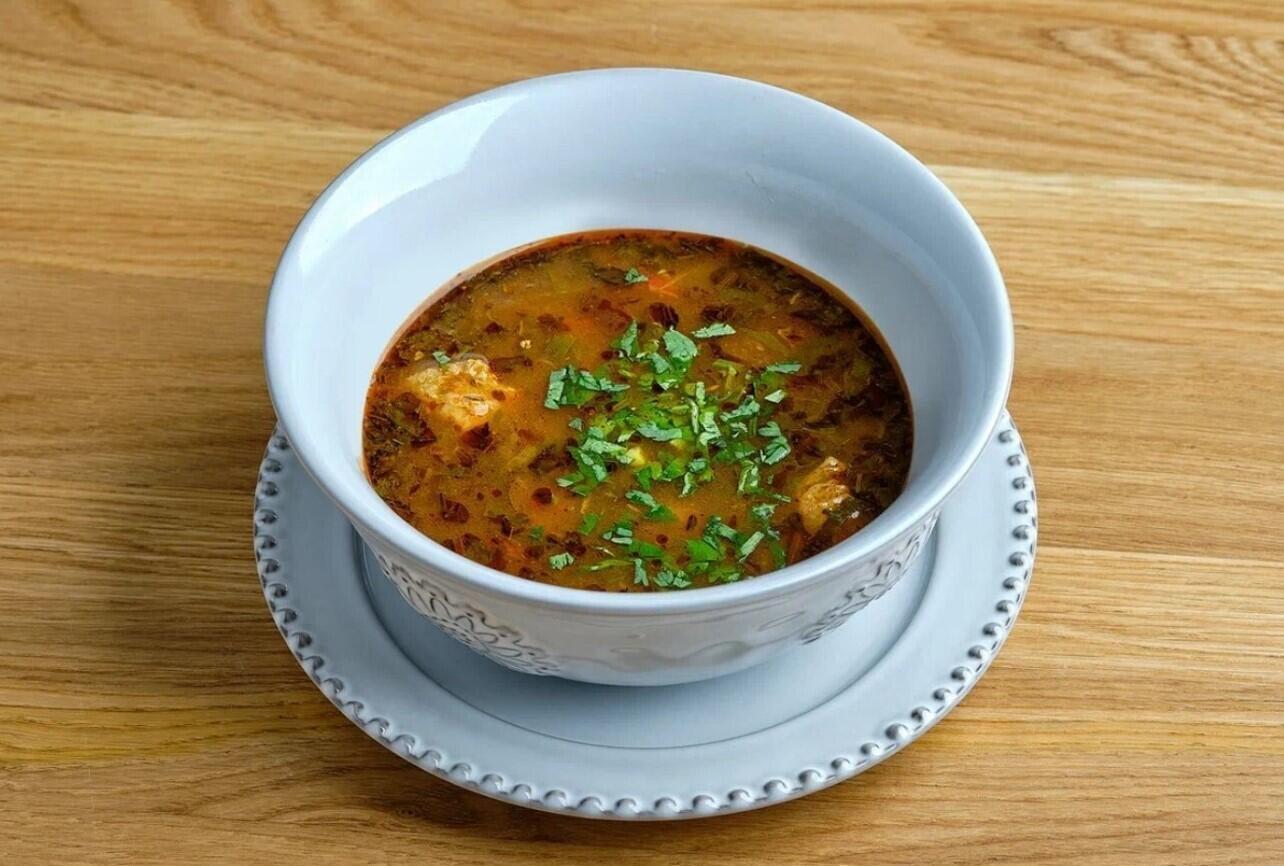 Говядина, лук репчатый, кинза, сельдерей листья, помидоры в собственном соку, томатная паста, чеснок, специя харчо сунели, соль сванская, аджика, масло растительное, вода, петрушка, уцхо молотый, кондари, лавровый лист, сахар песок.