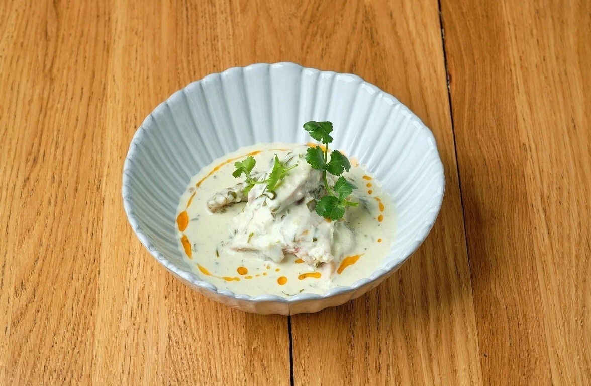 Курица в сливочном соусе Чкмерули, с чесночным маслом и ароматной кинзой