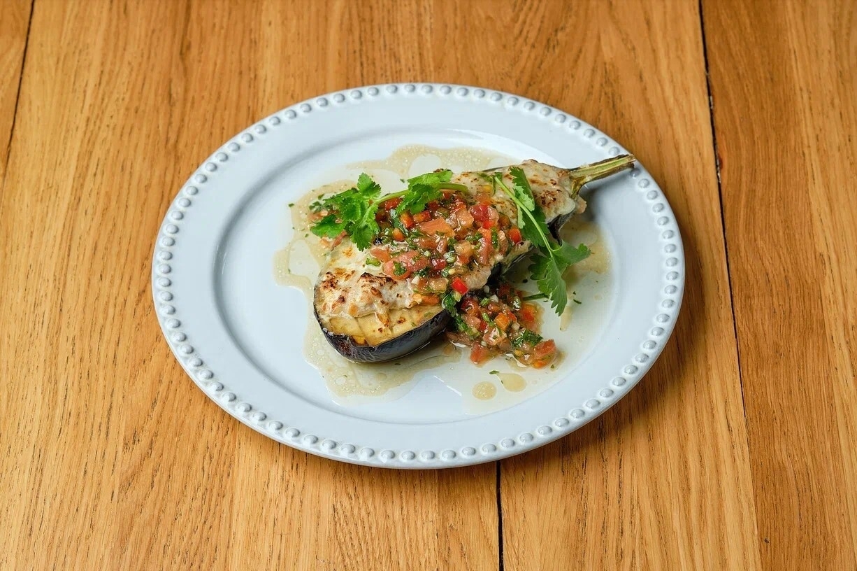 Запеченный баклажан с острой томатной сальсой, сванской солью и кинзой.