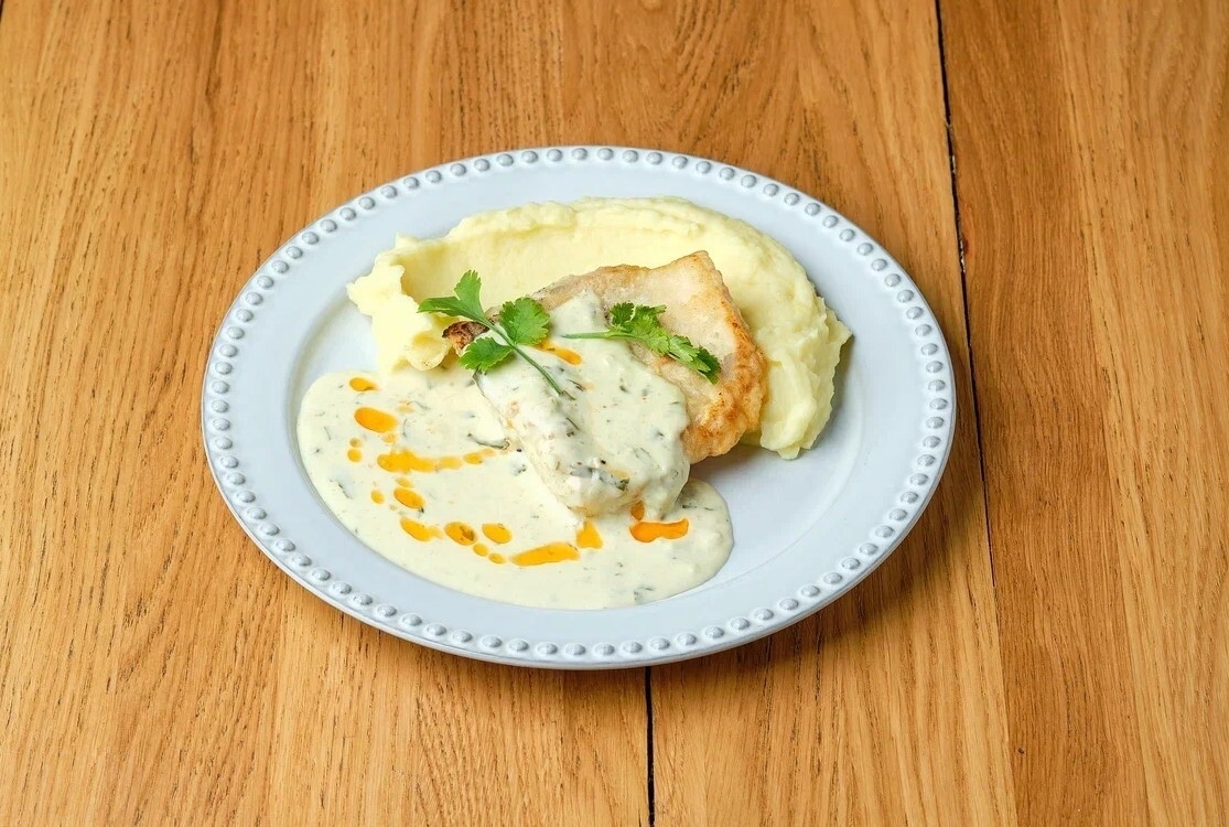 Филе судака, картофель, сливки, чесночное масло, специи, кинза.