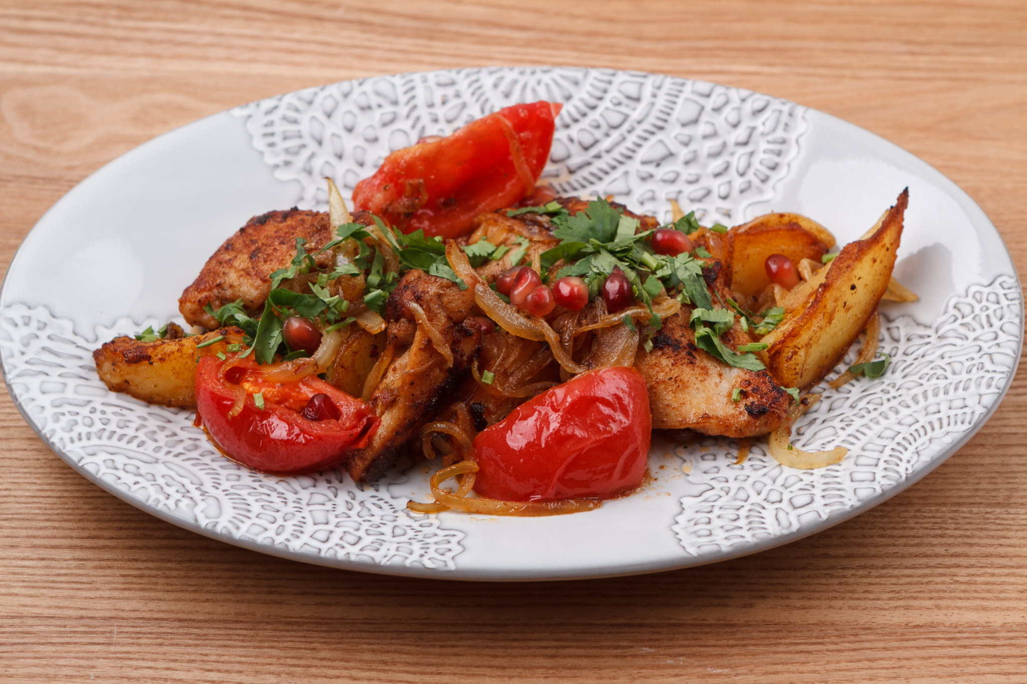 Курица, картофель, помидоры, лук репчатый, грузинские специи, кинза, зелень, зерна граната.