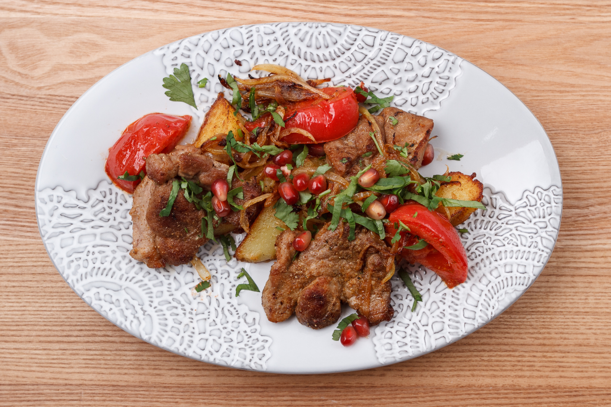 Свинина, картофель, помидоры, лук репчатый, грузинские специи, кинза, зелень, зерна граната.