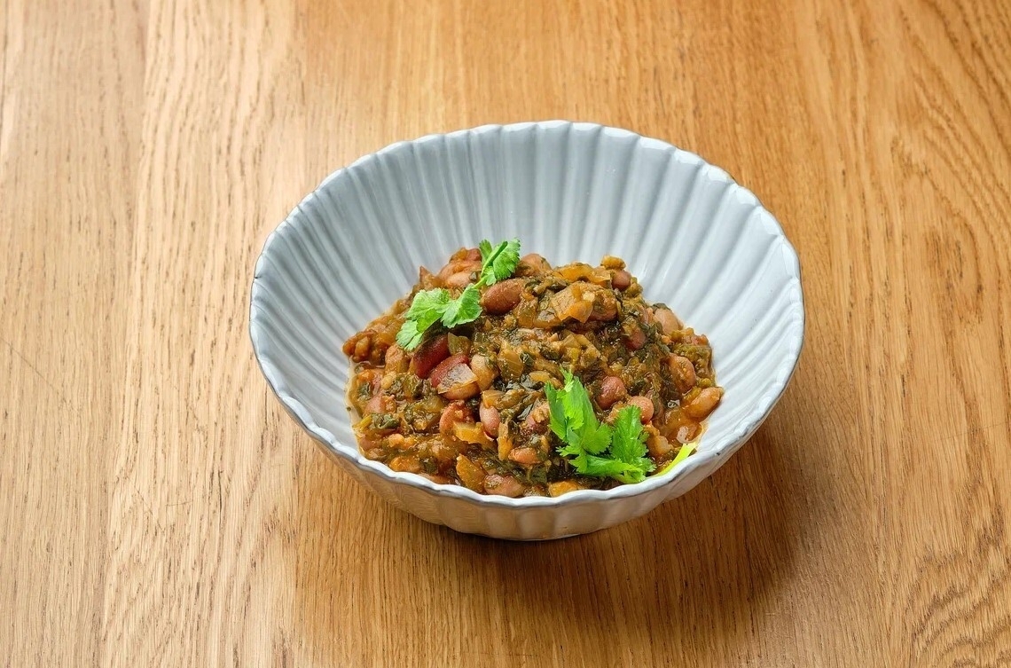 Грузинская закуска из фасоли и обжаренного репчатого лука.