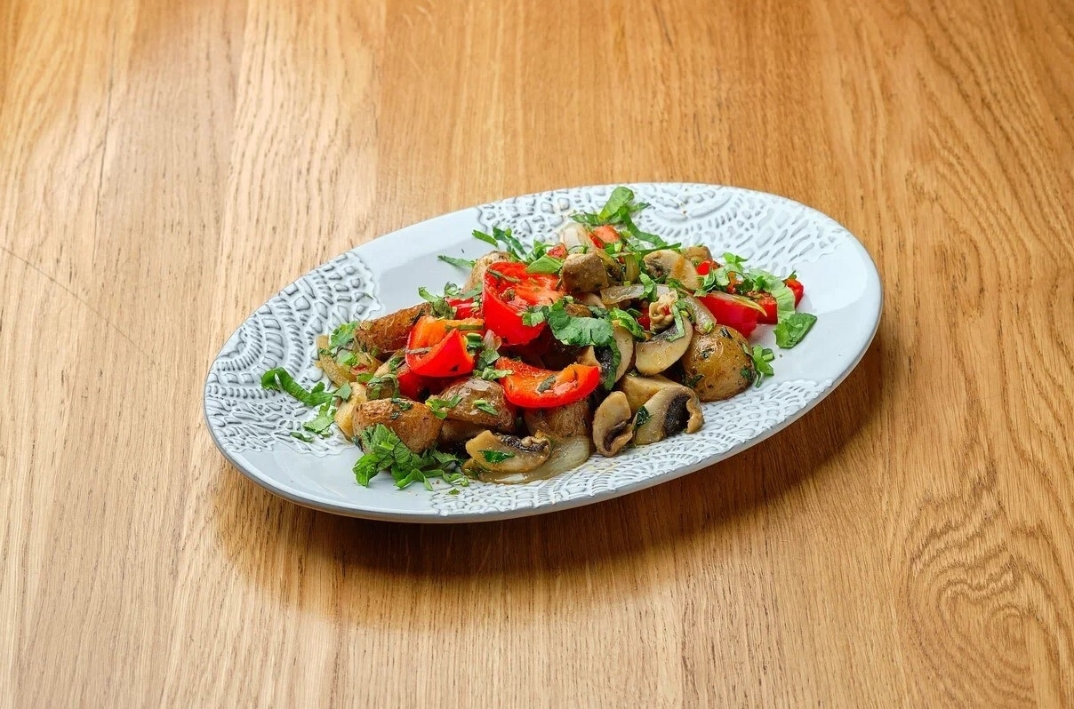 Легкий постный оджахури с картофелем, луком, грибами и томатами.