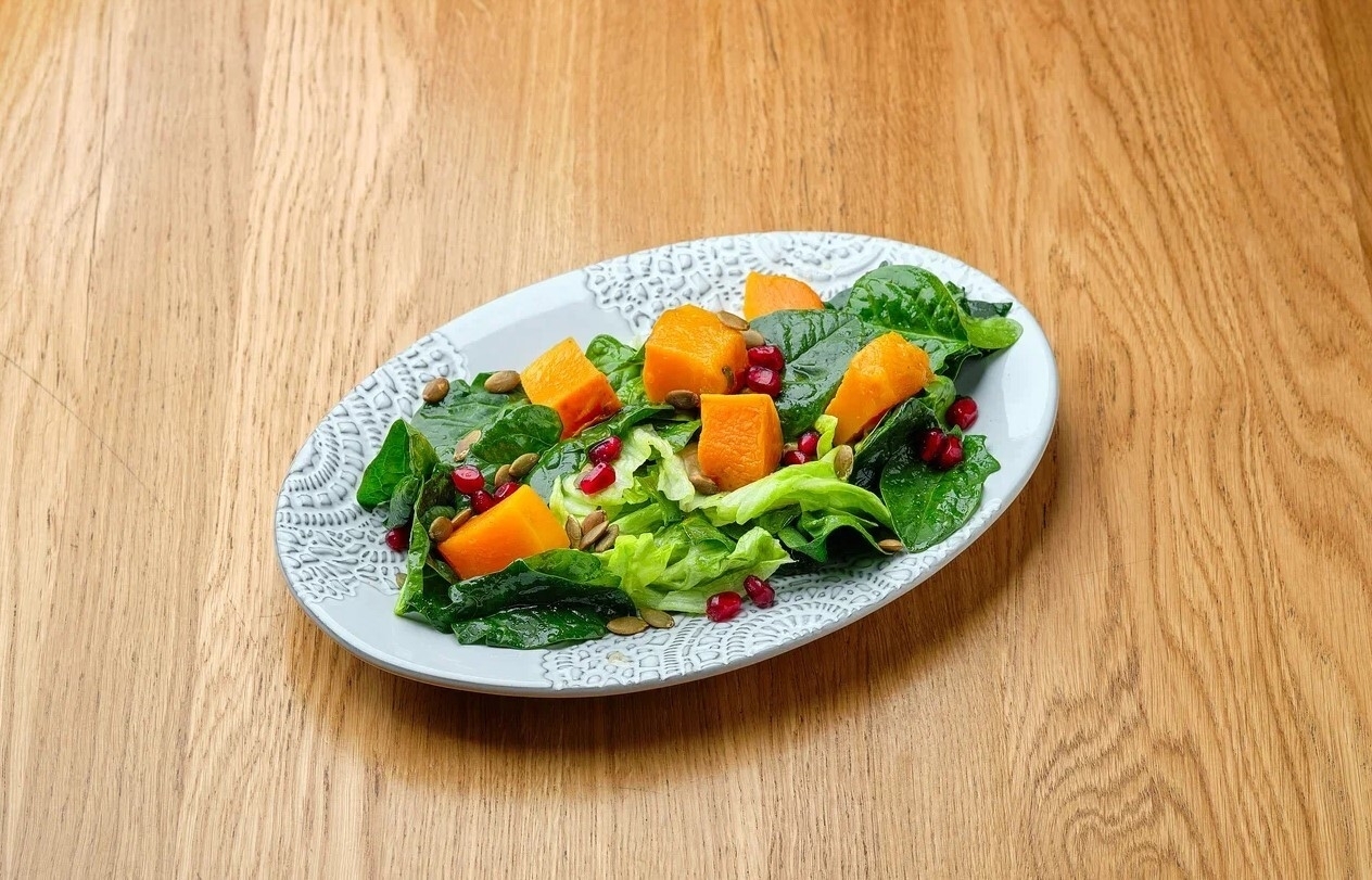 Салат с запеченной тыквой, миксом зелени, тыквенными семечками и зернами граната.