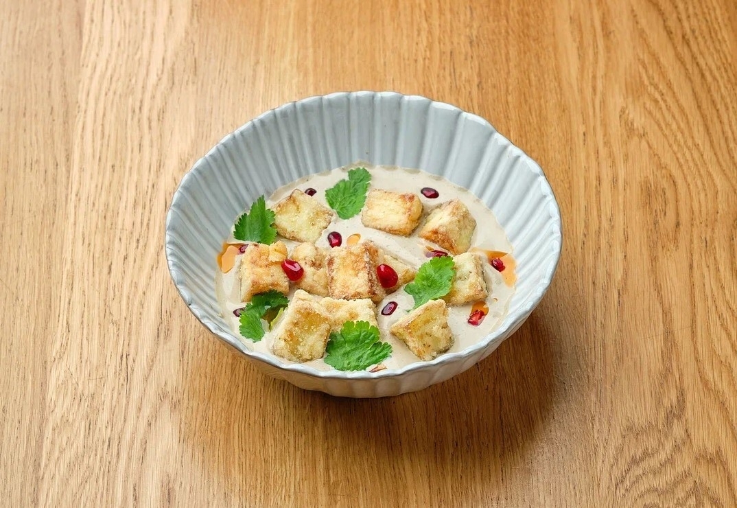 Картофель, молоко, сливочное масло, сливки, кахетинское масло, сванская соль, красный лук, печень, кинза, гранат.